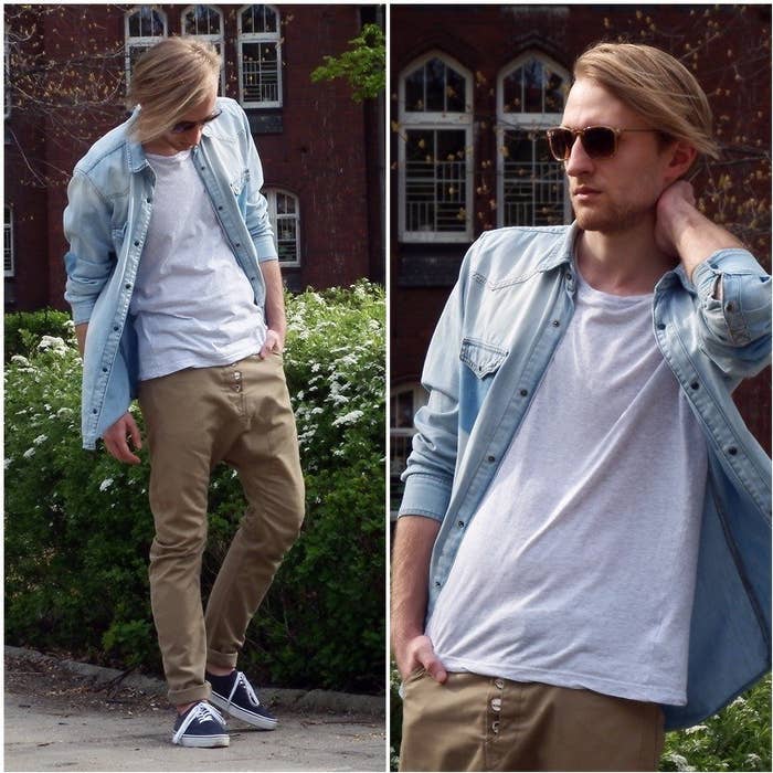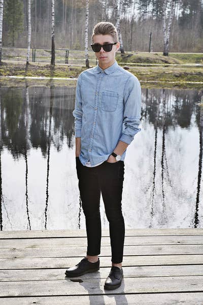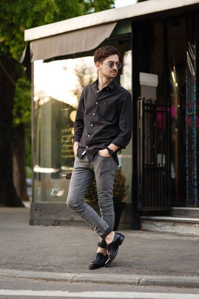 10. Anímate a llevar una camisa de denim, abotonada hasta arriba, con pantalones negros.